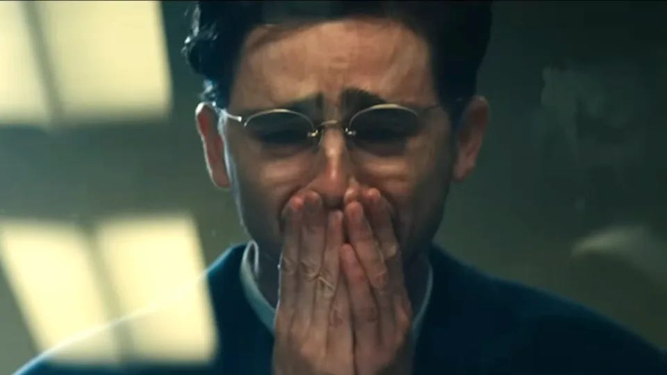 After his victory, Marty rushes back to the United States to attend to Rachel, his pregnant fuck buddy (Marty Supreme takes place in 1952, but I have no idea what the era-appropriate term would be for such an arrangement). He has denied paternity throughout the film, but his victory has changed something within him. The movie ends with a final shot of Marty standing at the nursery glass, looking at his son for the first time, absolutely crying his eyes out.